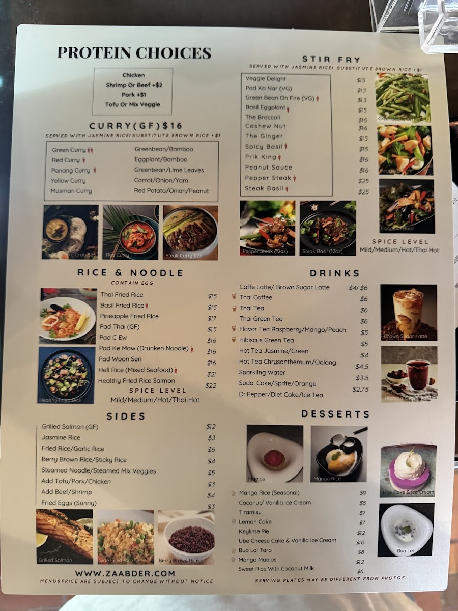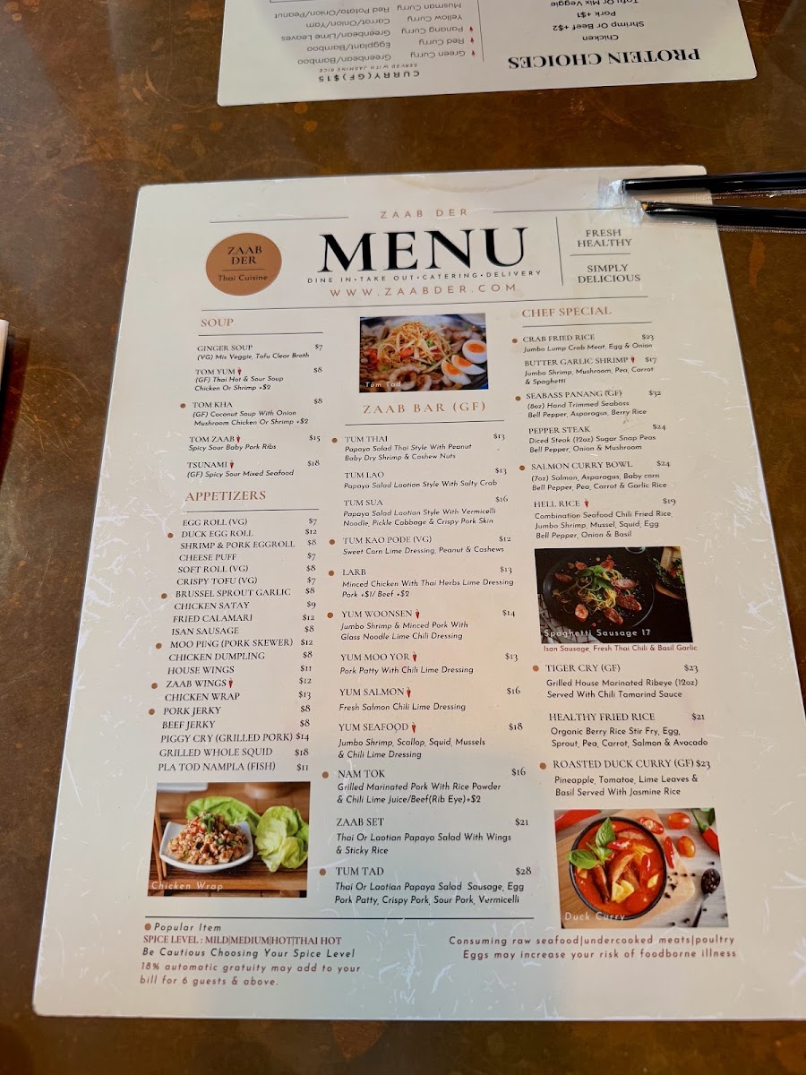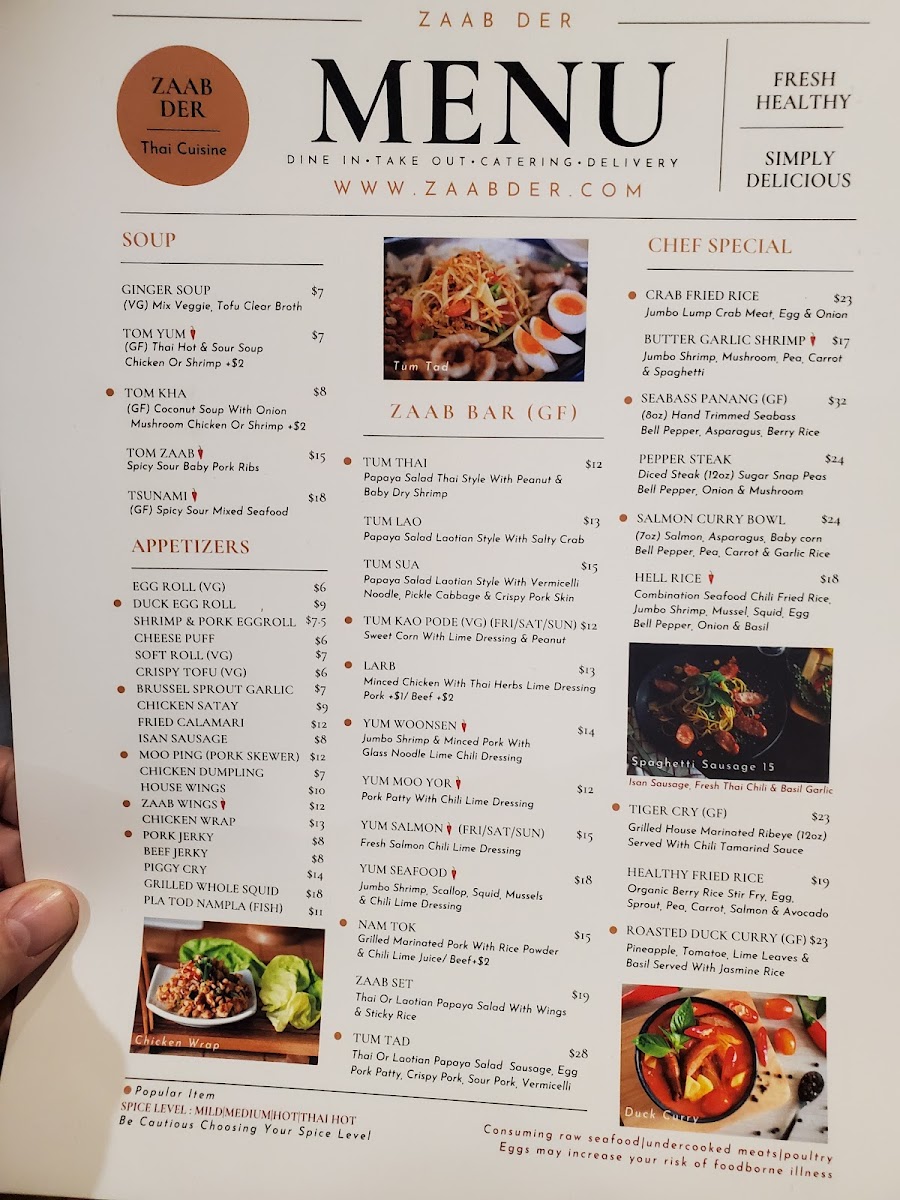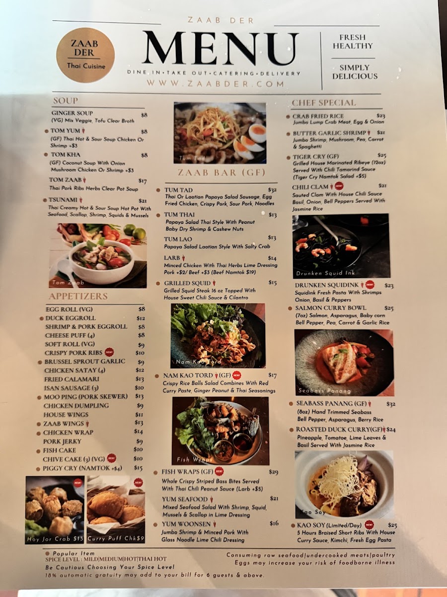 At Zaab Der, you’re in for an unforgettable dining experience filled with bold flavors and unique dishes that will transport your taste buds straight to Thailand. The Zaab Der Menu showcases a variety of mouthwatering options, from traditional favorites to exciting new creations, all crafted with the freshest ingredients. Whether you're in the mood for a spicy curry, a refreshing salad, or a comforting bowl of noodles, you’ll find something to love here. The menu balances rich, savory flavors with vibrant herbs and spices, making each dish an adventure. For those who enjoy a bit of heat, the chili-packed offerings are sure to delight, while milder options are perfect for those who prefer a more subtle taste. The atmosphere at Zaab Der is just as inviting as the food, making it a great spot for both casual meals and special occasions.